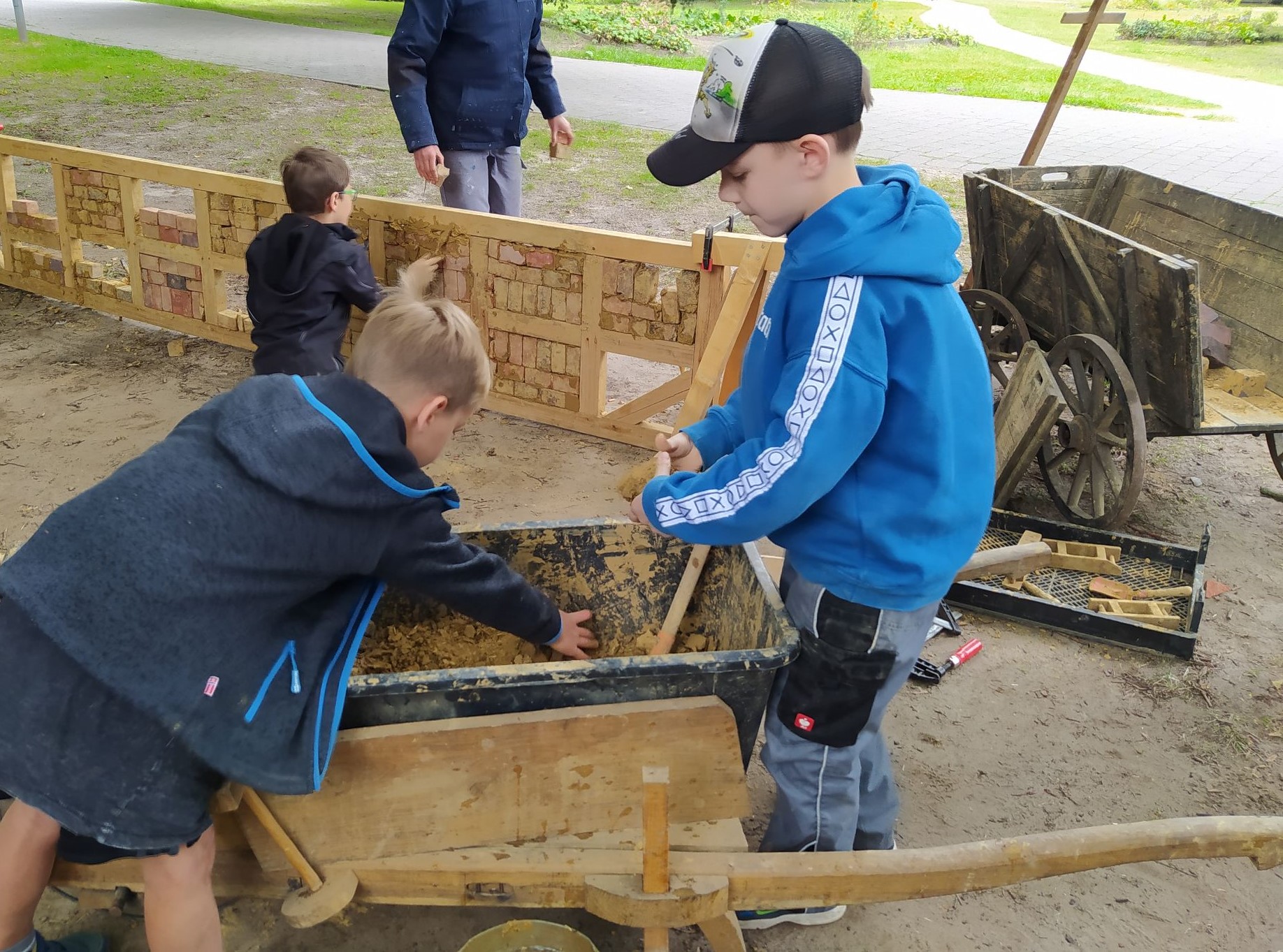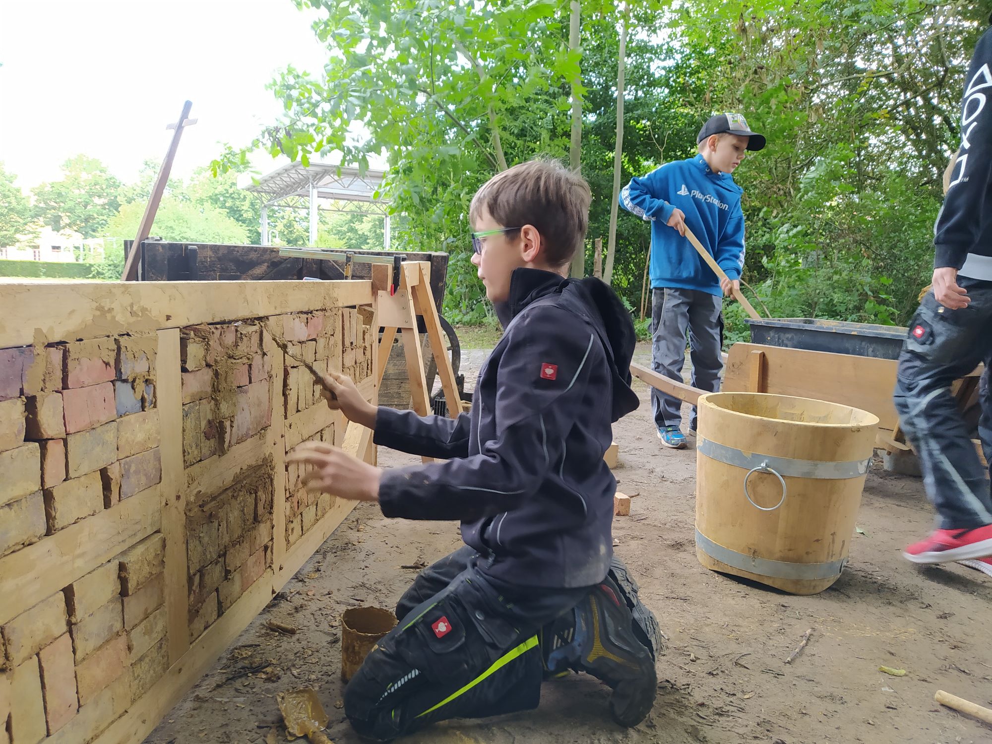 Beim Projekt stand das selbstständige Ausprobieren im Vordergrund: Die Kinder sollen nicht nur historisches Werkzeug entdecken, sondern auch selbst aktiv werden. Unter Anleitung von Museumspädagoge Tammo Hinrichs und Thomas Eulitz von der Reso-Fabrik e.V. lernten sie den Umgang mit Ziegeln, Holz und Lehm. Die Kinder bauten die Wand mit historischen Werkzeugen eigenständig – von der Herstellung der Holzverbindungen bis zum Vermengen des Lehms.