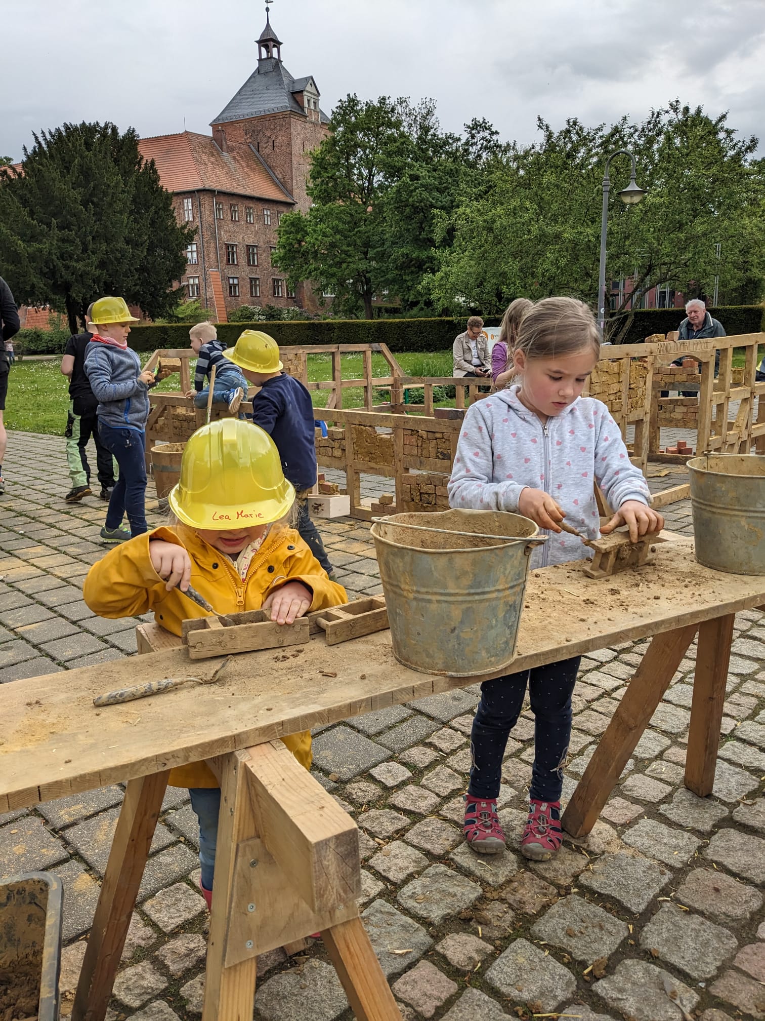 Die fertiggestellte Wand wurde am 30. Oktober mit einem kleinen Richtfest eingeweiht, bei dem etwa zwanzig Kinder ihre Arbeit präsentierten. Prof. Dr. Rolf Wiese vom Heimat- und Museumsverein lobte das Engagement der jungen Handwerker*innen und betonte die Bedeutung des Projekts für die pädagogische Arbeit des Museums, das mit der Kinderbauhütte ins Viertel ging.