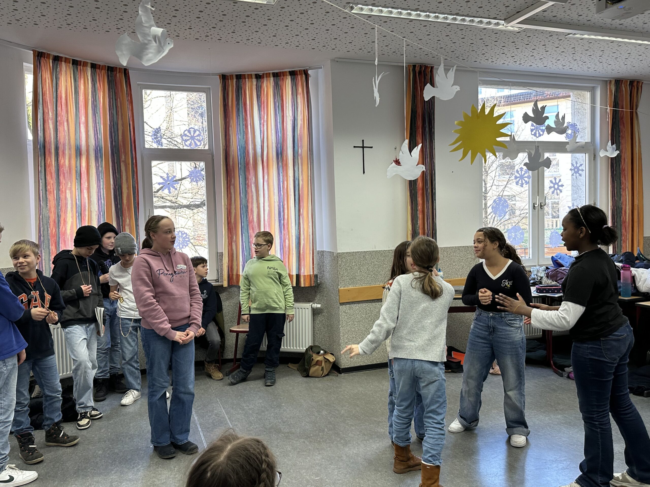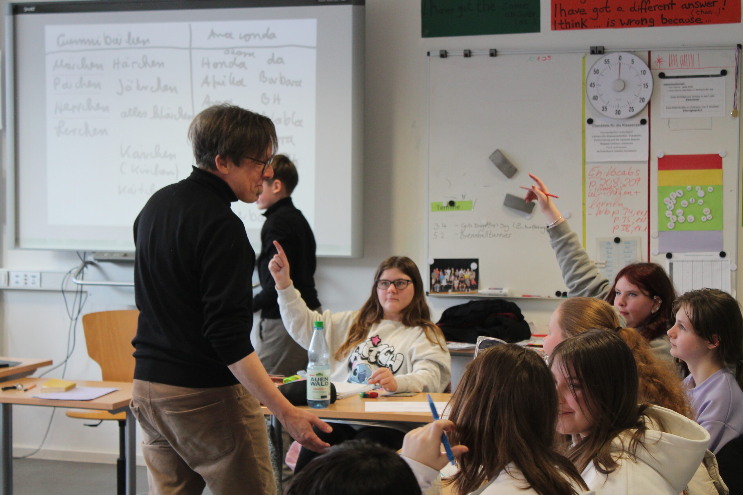 In der St. Ursula-Schule dahingegen stand ein Impro-Theater auf dem Lehrplan. Gemeinsam mit Autor Boris Pfeiffer haben die Kinder eine Geschichte und Strategien entwickelt, wie sie ihr Stück umsetzen und auf die Bühne bringen wollen. Der Zwei-Tages-Workshop reichte da nicht aus, um alle Kinderfantasien einmal durchzusprechen, doch die Klasse möchte gemeinsam mit ihrer Lehrerin weiter an dem Stück arbeiten und es zum Ende des Schuljahrs dann aufführen.