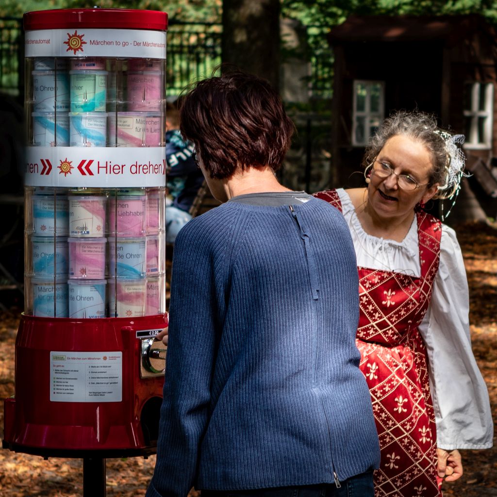 Not macht erfinderisch: Erzählerin Sabine Meyer vom Erzähltheater Osnabrück konnte, wie viele andere Künstler und Künstlerinnen auch, zu Beginn der Corona-Pandemie ihrem Wirken nicht mehr nachgehen. Wie kann sie ihre Existenz und die ihrer Kunst sichern, wenn sie nicht auf die Bühne darf, um ihre Geschichten zu erzählen? Wie kann sie ihre Märchen ohne menschlichen Kontakt weitergeben und dennoch das Analoge, das Persönliche und Besondere bewahren? So ersann sie die Idee eines Märchenautomaten, der für jede und jeden das passende Märchen bereithält. Unter anderem unterstützt von der VGH Stiftung kaufte die Erzählerin einen ausrangierten Snackautomaten im Internet, baute ihn nach ihren eigenen Wünschen um und befüllt ihn mit ihren Märchen. Nun kann sich jeder ein neues Märchen aus dem Automaten ziehen und dabei aus fünf Kategorien wählen: „Märchen von hier“, „Märchen für kleine Ohren“, „Märchen für große Ohren“, „Märchen von Sonderbarkeiten“ und „Märchen zum Liebhaben“. Für zwei Euro bekommt man eine Dose, in der, liebevoll in Tüll und Glitzer verpackt, ein Märchen darauf wartet gelesen und gehört zu werden.