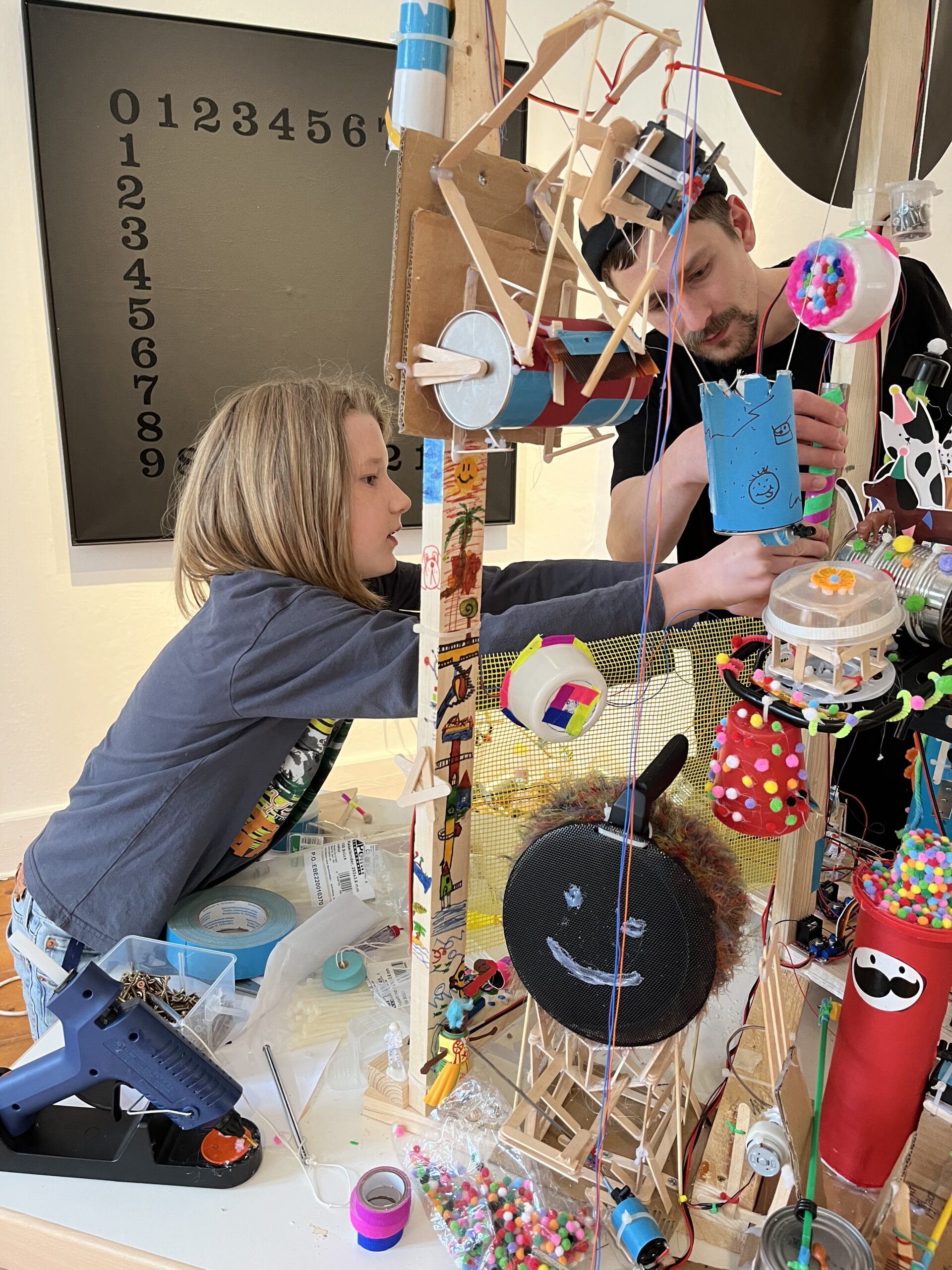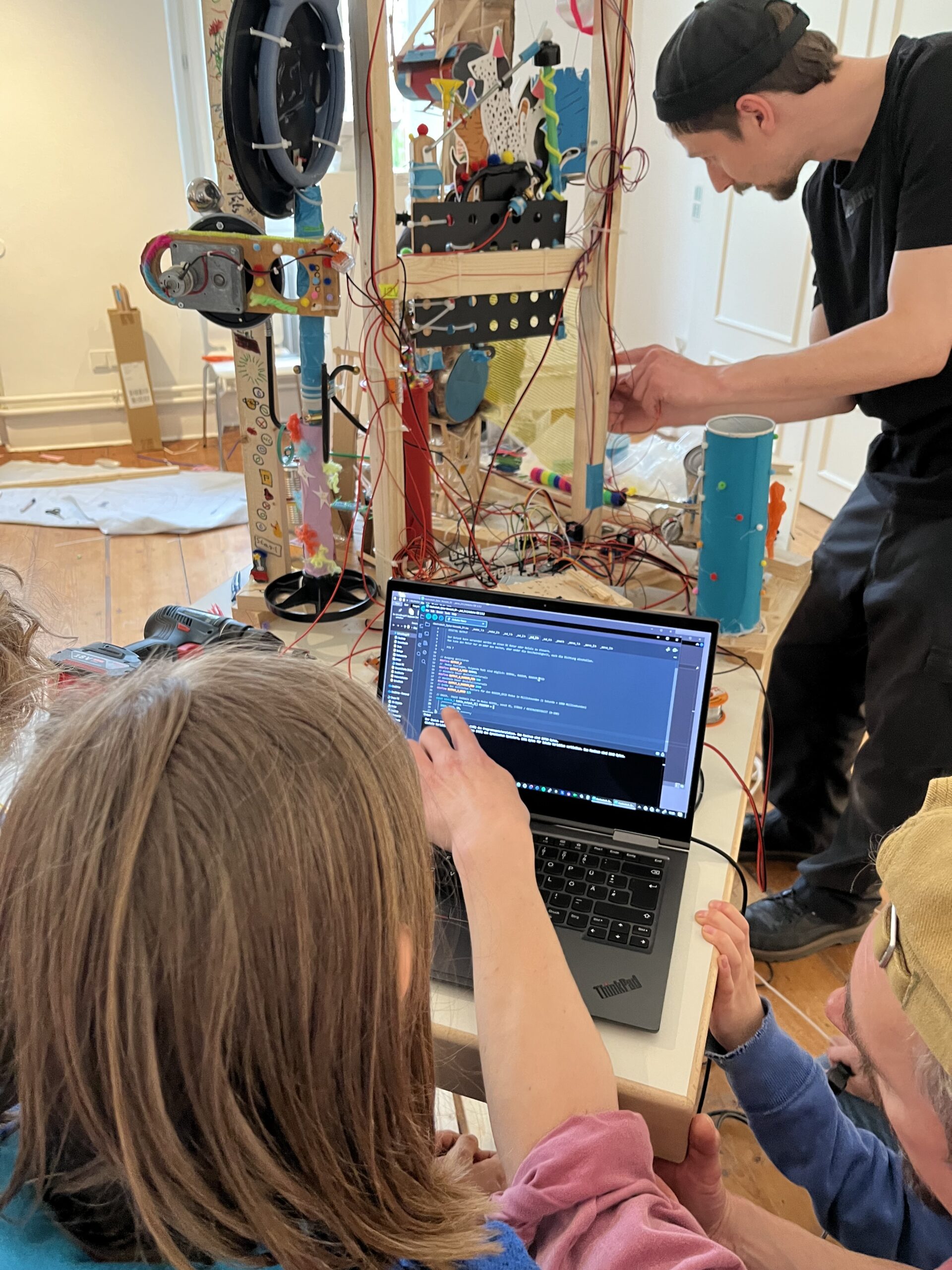 In dem Workshop hatten die Kinder nicht nur die Möglichkeit mit verschiedenen Materialien zu experimentieren und interessante Klänge zu erzeugen, sondern konnten auch Grundlagen der Programmierung erlernen. Am letzten Tag der Werkstatt präsentierten sie die gemeinsam entwickelte Klangskulptur interessierten Besucherinnen und Besuchern und führten ihre Soundmaschine in Aktion vor, die nicht nur „ritsch ratsch klick klack“ machte, sondern auch noch in verschiedenen Farben leuchtete.